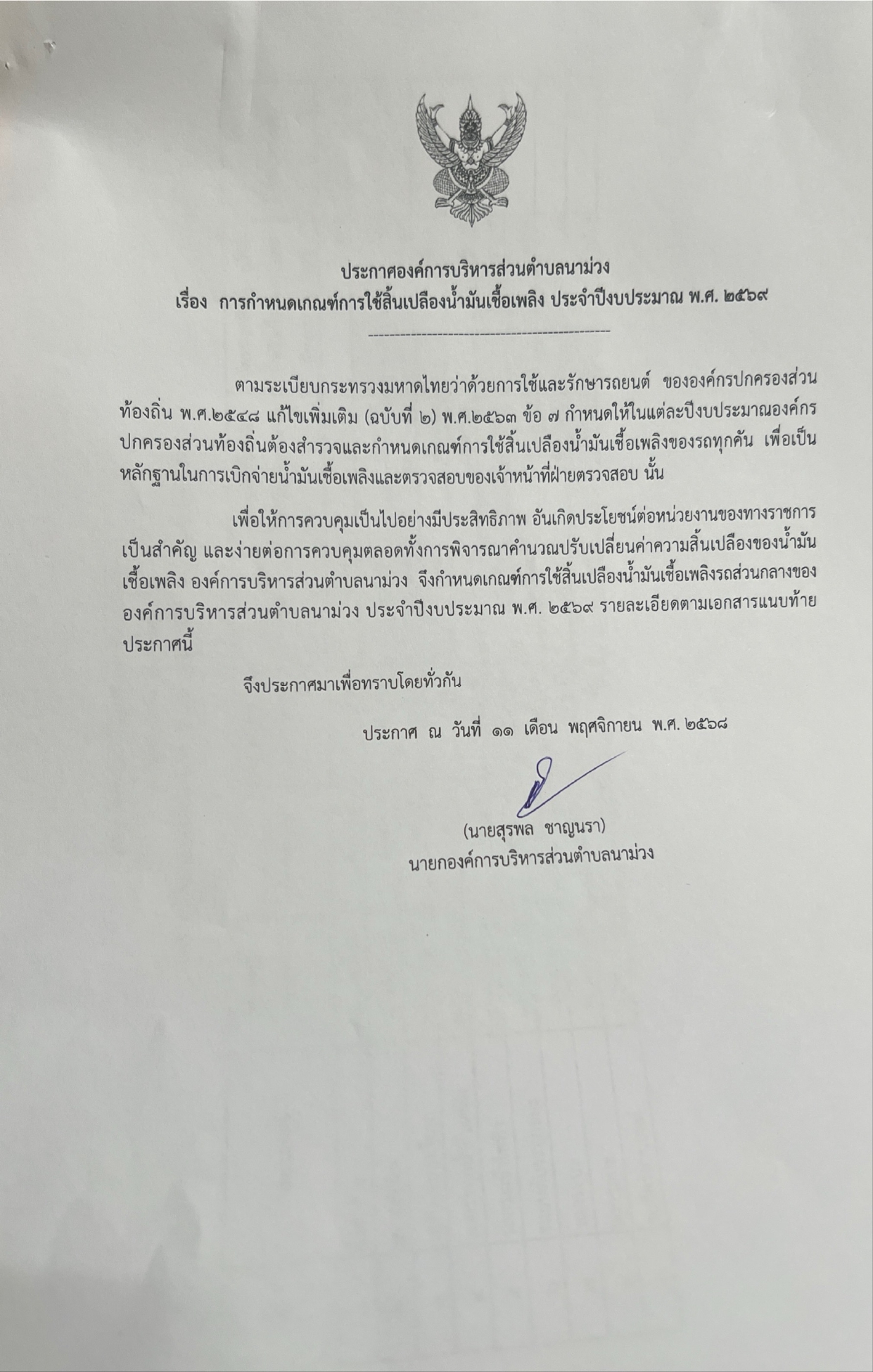 ประกาศองค์การบริหารส่วนตำบลนาม่วง เรื่อง การกำหนดเกณฑ์การใช้สิ้นเปลืองน้ำมันเชื้อเพลิง ประจำปีงบประมาณ พ.ศ.2569