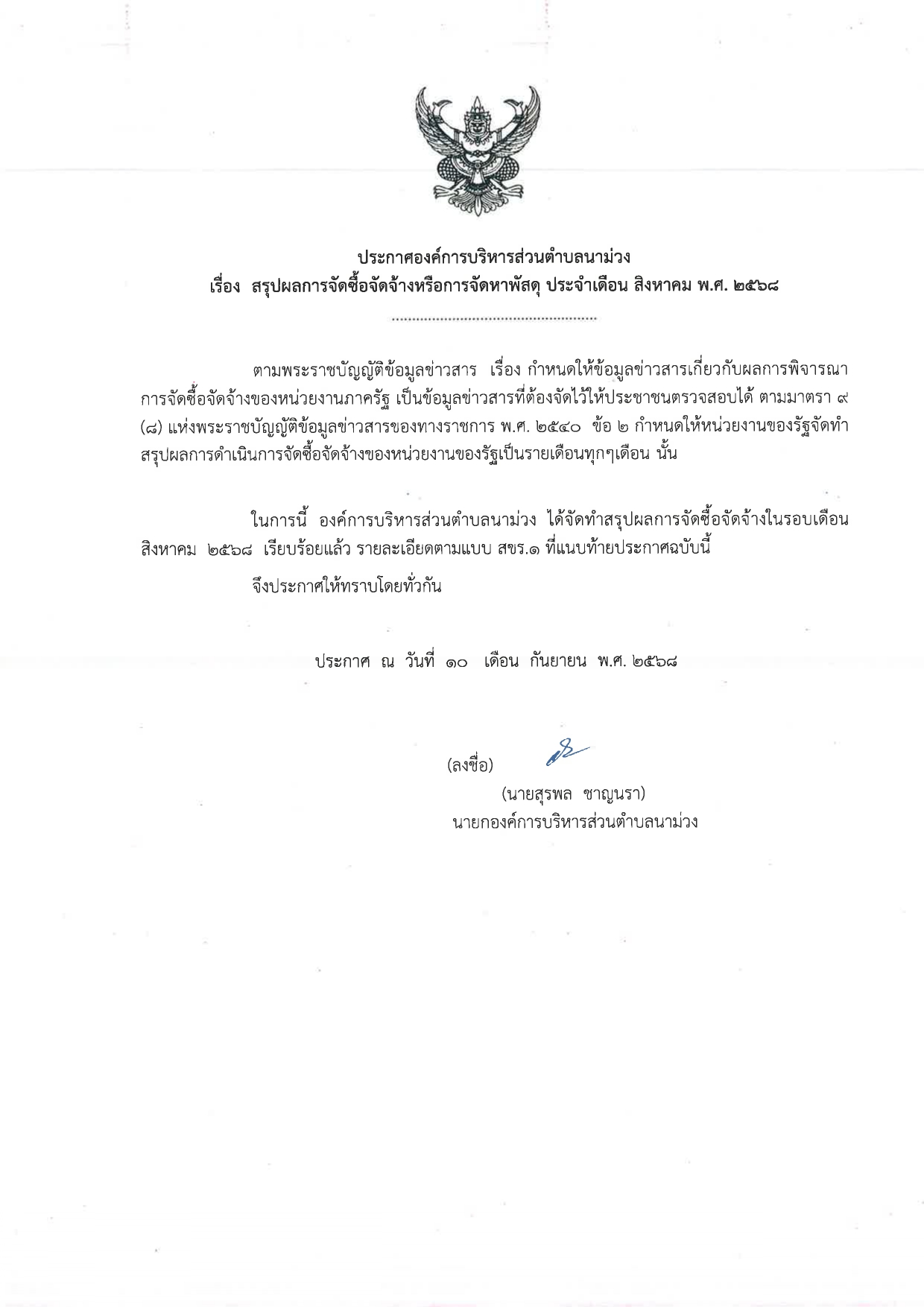 ประกาศองค์การบริหารส่วนตำบลนาม่วง เรื่อง สรุปผลการจัดซื้อจัดจ้างหรือการจัดหาพัสดุ ประจำเดือน สิงหาคม พ.ศ.2568