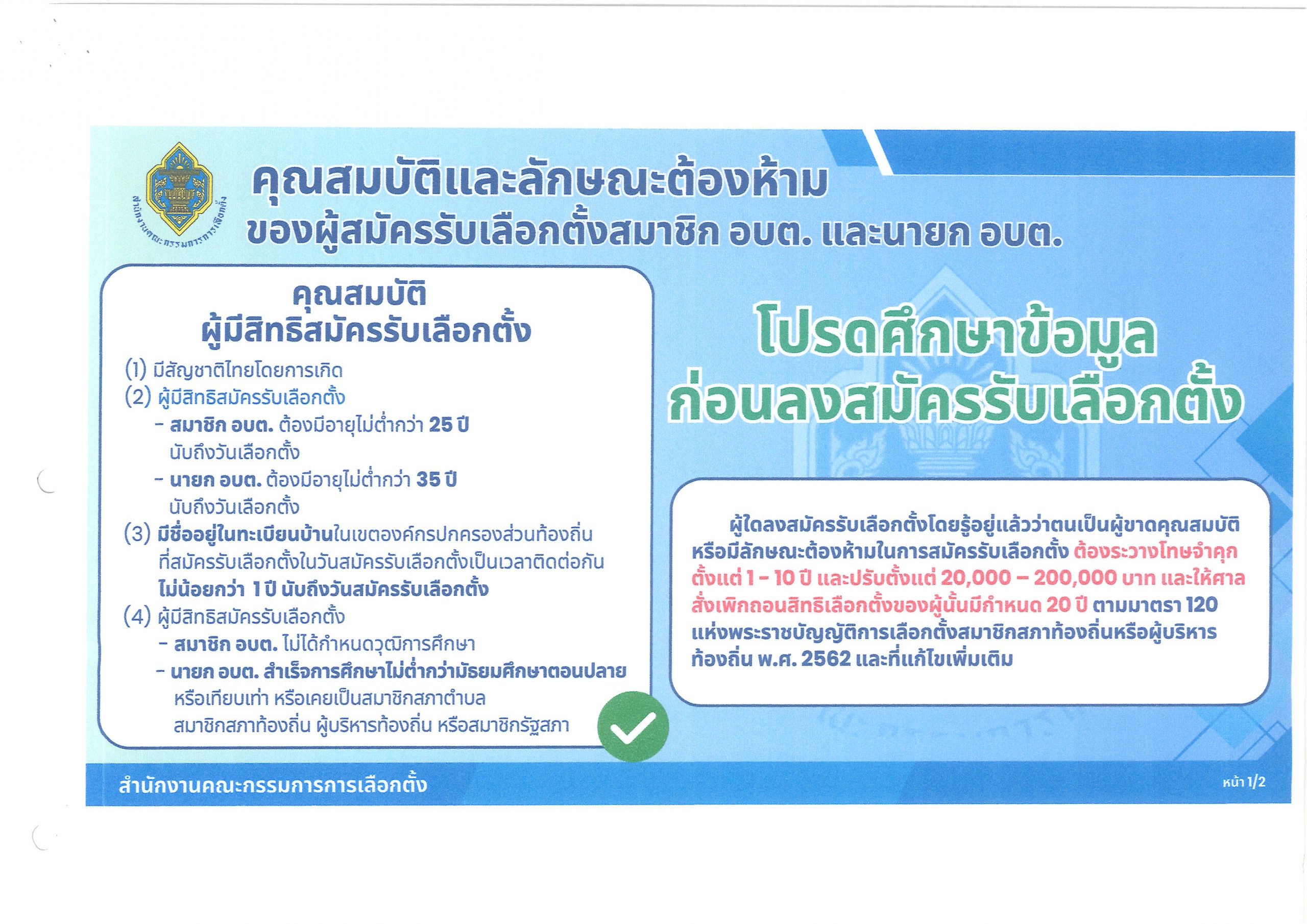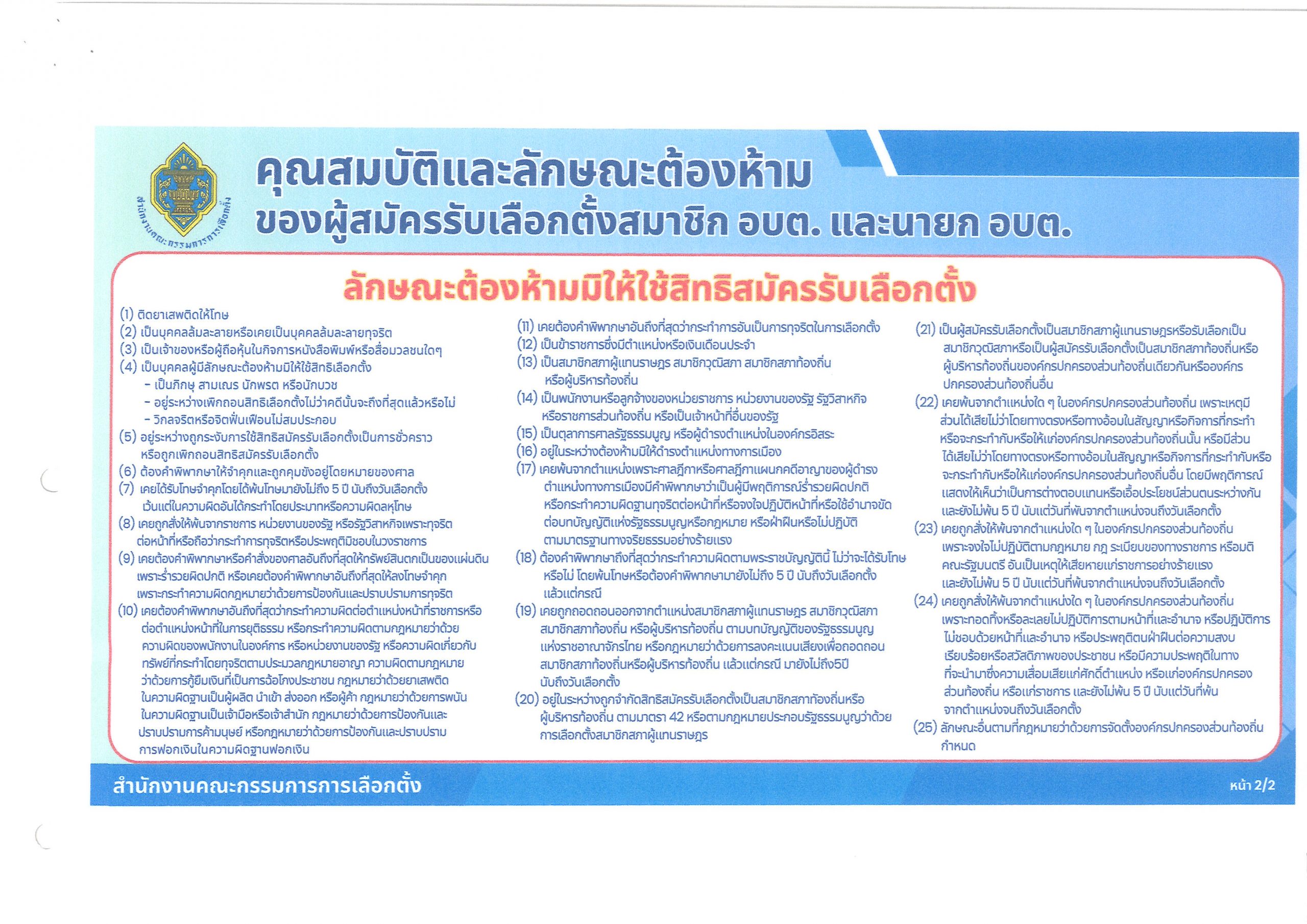 ประชาสัมพันธ์คุณสมบัติและลักษณะต้องห้ามของผู้สมัครรับเลือกตั้งสมาชิกสภาองค์การบริหารส่วนตำบลและนายกองค์การบริหารส่วนตำบล