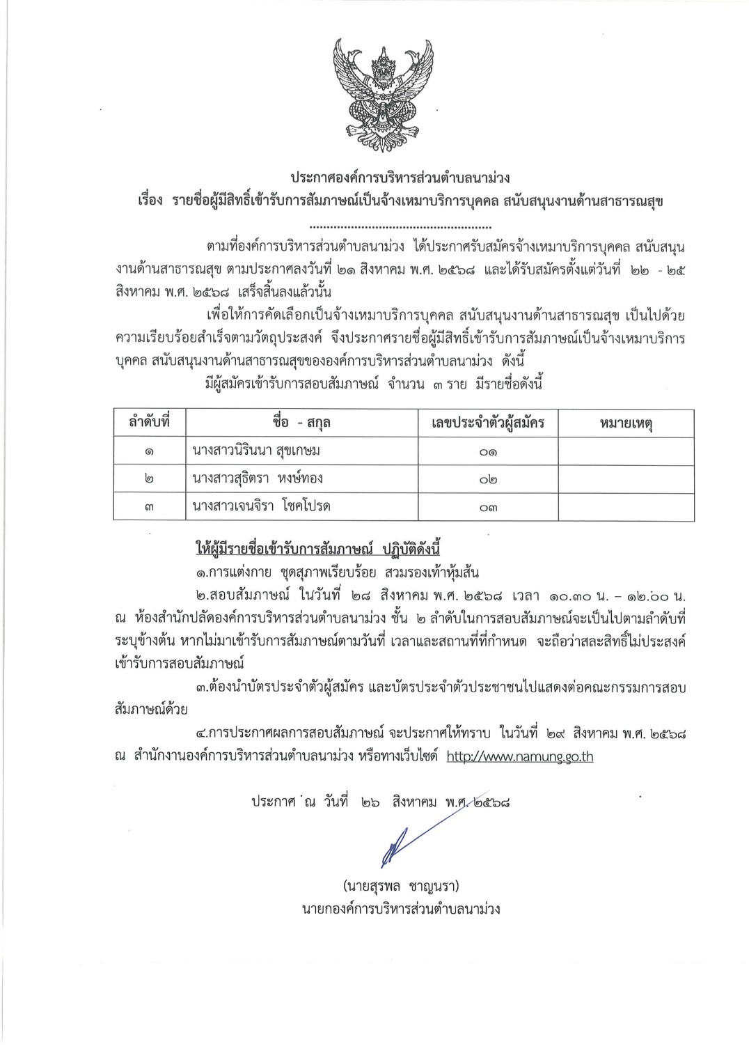 รายชื่อผู้มีสิทธิ์เข้ารับการสัมภาษณ์เป็นจ้างเหมาบริการบุคคล สนับสนุนงานด้านสาธารณสุข