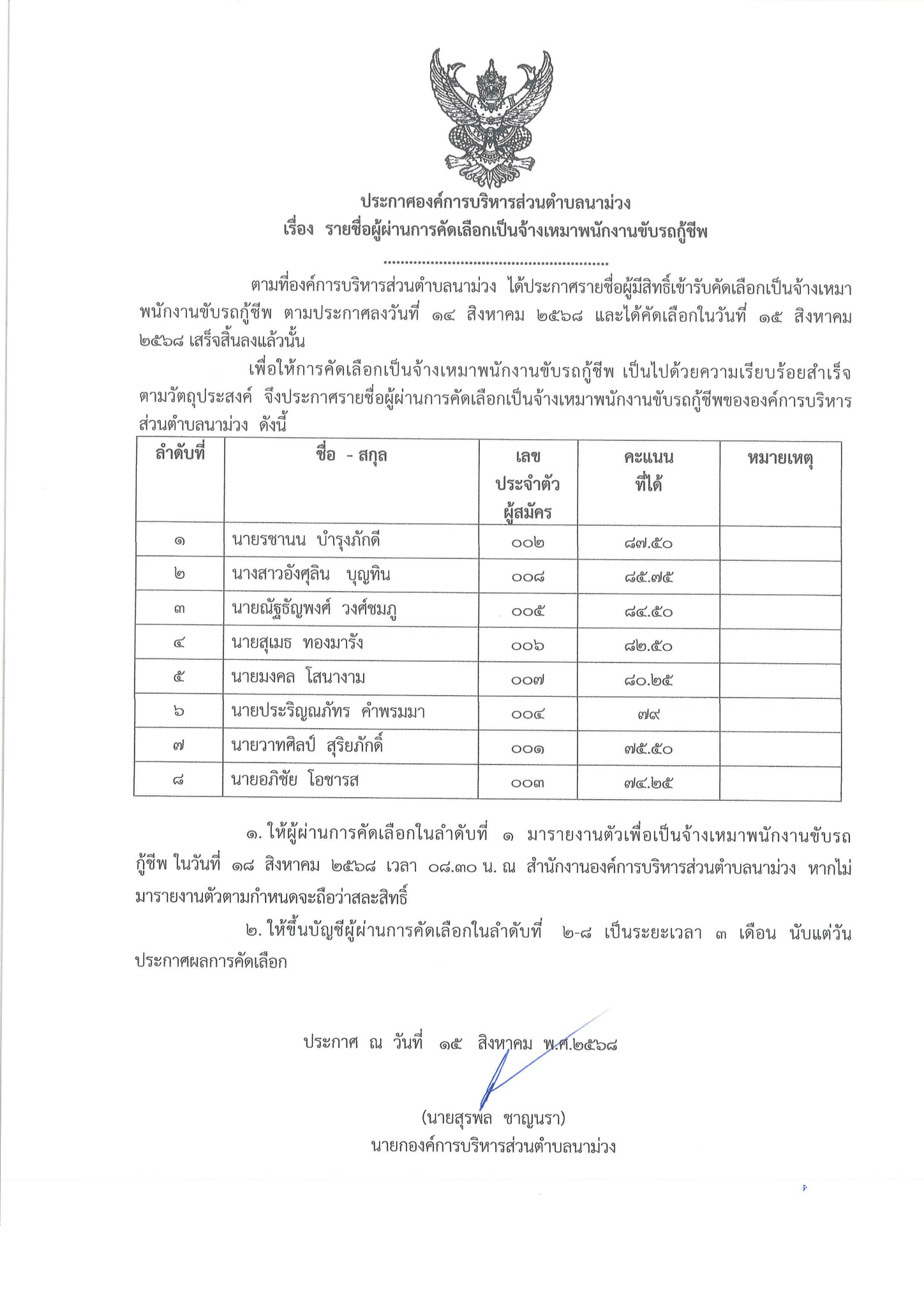 ประกาศองค์การบริหารส่วนตำบลนาม่วง เรื่อง รายชื่อผู้ผ่านการคัดเลือกเป็นพนักงานจ้างเหมาพนักงานขับรถกู้ชีพ