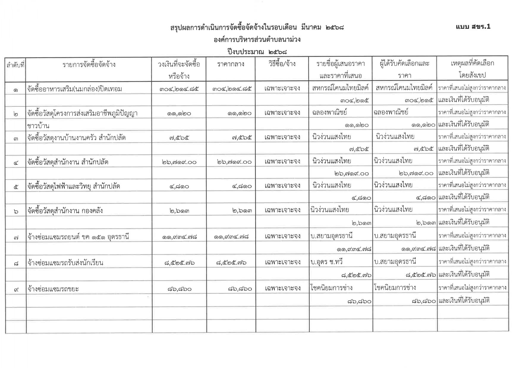 สรุปผลการจัดซื้อจัดจ้างหรือการจัดหาพัสดุ ประจำเดือน มีนาคม พ.ศ.2568
