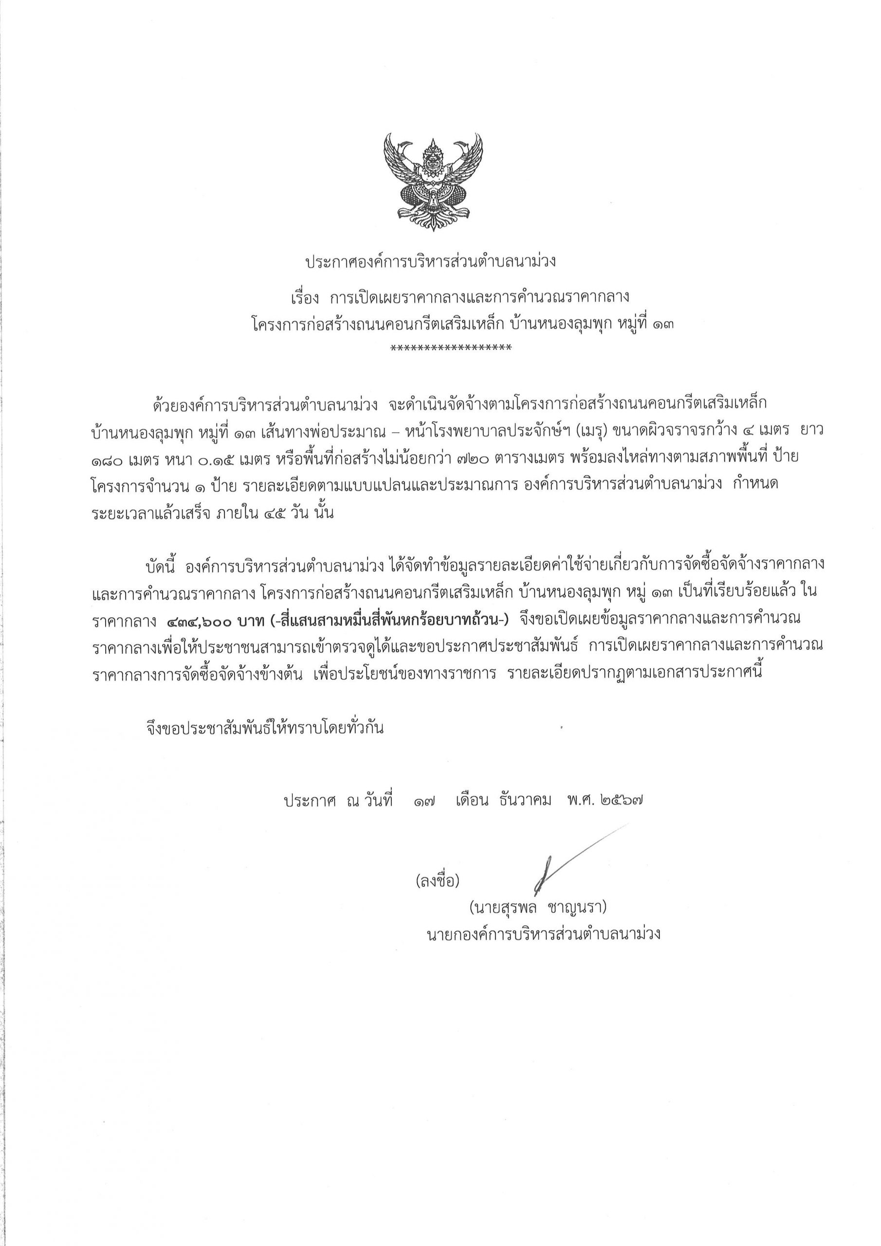 โครงการก่อสร้างถนนคอนกรีตเสริมเหล็ก บ้านหนองลุมพุก หมู่ที่ 13